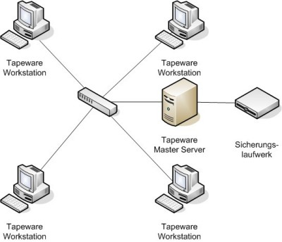 In diesem Szenario besteht das Sicherungssystem aus einem Tapeware Master Server, der ein Bandlaufwerk bedient. Weiterhin werden die vorhandenen Workstations im Netzwerk mitgesichert.
